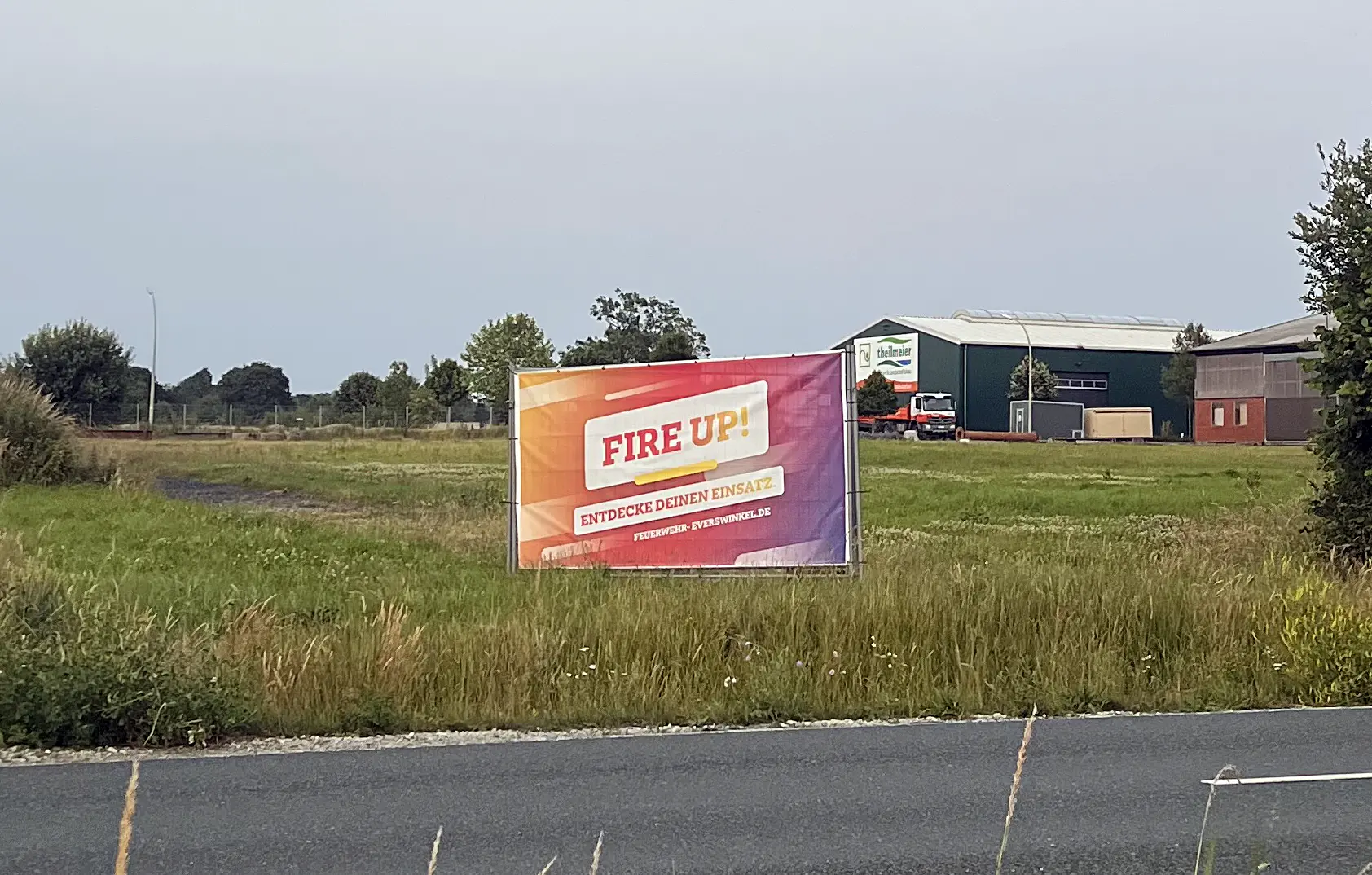 Unter dem Slogan „Fire Up!“ entstand ein kraftvolles Design, das sowohl auf einem Flyer als auch auf einer auffälligen Bauzaunplane umgesetzt wurde.